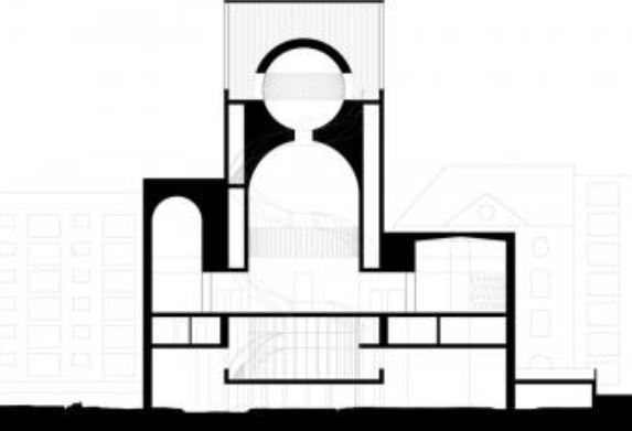 Baukörper dominiert der zentrale Kuppelsaal, ein